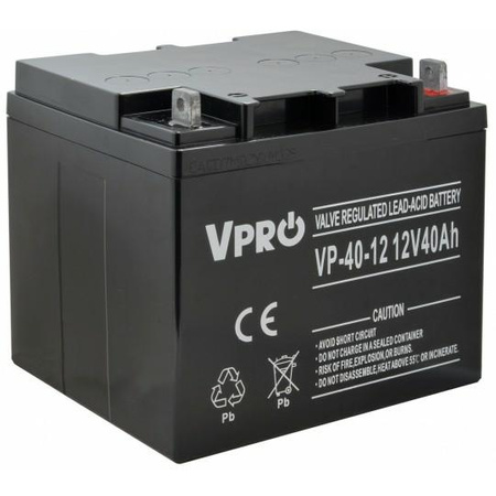 Akumulatory z serii VPRO 12V 40Ah wykonane w technologii AGM VRLA i głównie przeznaczone m.in.: do zastosowania w systemach zasilania awaryjnego (UPS, systemy automatyki), instalacjach solarnych oraz użycia wraz z przetwornicami napięcia. Najlepiej sprawdzają się w układach ładowania buforowego, jednak mogą być też stosowane w aplikacjach, w których akumulatory pracują cyklicznie. Dla głębokości rozładowania do 50 % posiadają około 650 cykli pracy. Projektowana żywotność wynosi 8-10 lat dla pracy w 20-25 °C