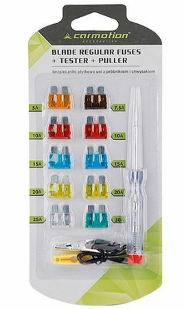 Bezpieczniki płytkowe wykonane z wysokiej jakości stopu cynku. Uniwersalny próbnik stosowany do wykrywania napięcia w zakresie 6-24V. Zestaw zawiera specjalny chwytak do bezpieczników płytkowych. W zestawie: