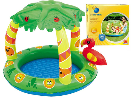 Uroczy brodzik firmy Bestway to propozycja dla dzieci lubiących pluskać się pod palmami. Basenik o wymiarach 99 x 91 x 71cm z daszkiem przeciw słonecznym zapewni mnóstwo frajdy każdemu dziecku. Kolorystyka wyjęta prosto z dżungli z kolorowymi zwierzętami zachęci każdego malca do wesołej zabawy w wodzie. Urocze biedronki, czerwony ptak i wesołe buzie lwiątek zachęcą każdego maluszka do wesołej zabawy. Basenik z daszkiem w kształcie palmy chroni dziecko przed promieniami słonecznymi, dno basenu jest pompowane dzięki czemu dziecko będzie miało komfort brykania w wodzie. Basen wykonany jest z wytrzymałego materiału PVC o grubości 0,24mm, posiada blokadę przed upływem powietrza.,,Dane techniczne:,- wymiar 99 x 91 x 71cm,- pojemność basenu 26l,- materiał PVC o grubości 0,24mm,- pompowane dno,- miękkie dmuchane ścianki,- daszek przeciw słoneczny z UPF 50+,- atrakcyjna kolorystyka prosto z dżungli,- kolorowa papuga,- dla dzieci od 2 roku życia,- zestaw zawiera łatkę naprawczą,,Informacja o bezpieczeństwie