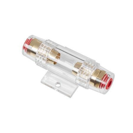 Samochodowa oprawa bezpiecznika do zamontowania na przewód zasilający, przeznaczone dla bezpieczników rurkowych 10.3 x 38 mm, stosowanych w samochodowych instalacjach CAR-AUDIO. Posiada możliwość montażu do podłoża.