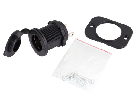 Montaż poprzez wywiercenie w płaskiej powierzchni otworu montażowego, wsunięcie gniazda i przykręcenie dwoma wkrętami - idealne do zamocowania np. w bagażniku samochodu.