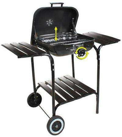GRILL OGRODOWY Z POKRYWĄ KAMINER - produkt polskiej marki, oferującej szeroko pojęty asortyment kominkowo – grzewczy. REGULOWANY RUSZT - za pomocą pokrętła z łatwością możesz regulować wysokość rusztu na jedzenie, dzięki czemu możesz kontrolować temperaturę smażenia. SPECYFIKACJA - kolor czarny; ruszt chromowany; waga ~9,15kg; wymiary po rozłożeniu 97,5x46,5x82cm; kocioł 46,5cm; średnica kół 14,5cm; ruszt 39,5x39,5cm. REGULACJA DOPŁYWU POWIETRZA - pozwoli na grillowanie dokładnie w takiej temperaturze jakiej potrzebujesz. PRAKTYCZNY - koła ułatwiają przemieszczanie grilla - wystarczy lekko unieść grill i pociągnąć za uchwyt. Na półkach można ułożyć talerze, akcesoria grillowe i jedzenie, zamiast chodzić od grilla do stołu. SPECYFIKACJA kolor: czarny ruszt: chromowany (2 szt – jeden na jedzenie, drugi na węgiel) waga grilla: 8kg waga z opakowaniem: 9,15kg WYMIARY po rozłożeniu (szer/dł/wys): 97,5x46,5x82cm kocioł (szer/dł): 46,5cm