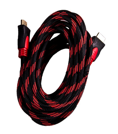 Kabel HDMI w oplocie tekstylnym z pozłacanymi wtykami.,,Wersja HDMI: 1.4b,Obsługa rozdzielczości: FULL HD 4096x2160p24 (4Kx2K),Stop kabla: OFC (99,9% czystości),Rodzaj kabla: 19 pinowy,Transmisja dźwięku: pełne wsparcie 7.1 HD Digital,Technologia odświeżania: pełne wsparcie do 1000Hz,Kanał Ethernet: TAK,Zwrotny kanał Audio (ARC): TAK,3D przez HDMI: TAK,AV-sync: TAK,DTS-HD Master Audio: zgodny,Certyfikaty: RoHS, CE, HDCP, HDMI,,Długość kabla: 5 metrówInformacja o bezpieczeństwie
