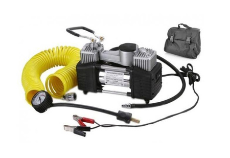 Kompresor wyposażony jest w poliuretanowy pneumatyczny wąż wraz z bezpiecznikiem, który chroni kompresor przed uszkodzeniem. Podłączany jest do akumulatora samochodowego za pomocą dołączonych żabek. Z tyłu posiada wyłącznik ON/OFF co znacznie ułatwia pracę z urządzeniem.,,,,Specyfikacja techniczna:,Wykonany z wysokiej jakości materiałów,Napięcie zasilające: 12V-15V DC,Natężenie prądu: 23 A,Podłączany do akumulatora za pomocą żabek,Długość kabla zasilającego do akumulatora: 3m,Wydajność: 65L/Min.,Maksymalne ciśnienie: 150 PSI/10 Bar,Długość pneumatycznego węża do pompowania powietrza: 5m,Długość gumowego węża do pompowania powietrza: 28cm,Wymiary: 25cmx16cmx10cm,,Dodatkowe wyposażenie:,Przełącznik ON/OFF,Składany uchwyt do przenoszenia,Gumowe nóżki dla lepszej stabilizacji kompresora,BezpiecznikInformacja o bezpieczeństwie