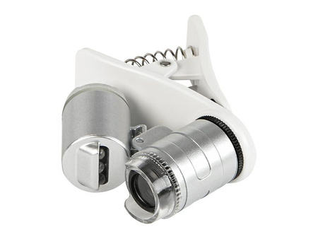 Mikroskop z podświetleniem białym lub ultrafioletowym przeznaczony do wbudowanych aparatów fotograficznych w telefonach komórkowych. Do wysuwanego obiektywu został przymocowany dedykowany klips na sprężynie, który umożliwia zamocowanie produktu na komórce, a dzięki znajdującej się na styku klipsów piance obudowa telefonu nie powinna w żaden sposób zostać uszkodzona. Produkt skierowany jest głównie do miłośników fotografii, ponieważ zapewnia aż 60-krotny zoom, jednak jego gama zastosowań jest o wiele większa i świetnie sprawdzi się np. podczas konieczności dokładnego obejrzenia produktów różnego rodzaju. W zestawie znajduję się także dedykowany woreczek, który ułatwi transport urządzenia.