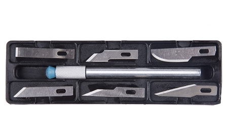 Zestaw nożyków do precyzyjnego przycinania. Bardzo przydatne np. przy pracach modelarskich.,,Cechy produktu:,,Produkt fabrycznie nowy.,6 ostrzy o różnych kształtach,Łatwo i szybko wymieniane ostrza,1 rękojeść w zestawie - pasująca do wszystkich ostrzy.,Ergonomicznie wykonane, wygodne w użyciu.,Całość zawarta w pudełku z tworzywa sztucznego - wyposażonego w pasek magnetyczny zapobiegający przemieszczaniu się ostrzy.,Idealnie sprawdzi się przy pracach modelarskich i majsterkowaniu oraz do cięcia kartonów, PCV, tapet itp.,W zestawie:,,Zamykane pudełko z paskiem magnetycznym, zapobiegającym przemieszczeniu się ostrzy.,1 uniwersalna rękojeść o wymiarach 9,5cm x 0,8cm x 0,8cm,6 płaskich ostrzyInformacja o bezpieczeństwie