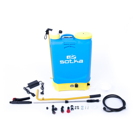 Opryskiwacz o pojemności 16 l dwunapędowy,,Opryskiwacz plecakowy posiadający zbiornik plastikowy otwarty (nie wytwarza się w nim ciśnienie). Ciśnienie potrzebne do rozpryskiwania cieczy wytwarza się za pomocą ruchów pionowych pompki tłokowej ręcznej lub za pomocą pompki elektrycznej zasilanej akumulatorem. Akumulator litowo-jonowy wbudowany w podstawę opryskiwacza ma wystarczającą pojemność do pracy przez około 3 godziny. Zużytą energię akumulatora uzupełnia się za pomocą ładowarki elektrycznej.,,Istnieje możliwość korzystania z innych niż standardowa lanc teleskopowych będących w naszej ofercie w celu lepszego dostępu do oddalonych nawet o 2,5 metra miejsc przeznaczonych do opryskiwania. Można też stosować lance poczwórną lub podwójną do opryskiwania roślin rosnących w rzędach obok siebie.,,Z tyłu zbiornika zamocowane są regulowane szelki do założenia na plecy.Informacja o bezpieczeństwie