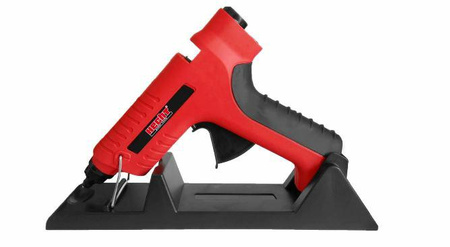 Elektryczny pistolet termotopliwy HECHT 1812 z podstawką dokującą. Pistolet akumuluje ciepło, w związku z tym pracy nie ogranicza przewód zasilający. Ciepło jest stale gromadzone za każdym razem jak pistolet jest odłożony między klejeniami.