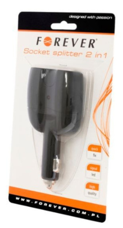 Rozgałęziacz gniazda samochodowego 2w1 marki Forever pozwala na podłączenie dwóch urządzeń elektronicznych w jedno gniazdo zapalniczki samochodowej. Szczególnie przydatny gadżet dla osób, które często korzystają z kilku urządzeń elektronicznych jednocześnie np. telefonu, laptopa, odtwarzacza mp3 itp. Do przejściówki można podłączyć praktycznie wszystkie urządzenia elektroniczne korzystające z zasilania o napięciu wejściowym 12 V.Informacja o bezpieczeństwie