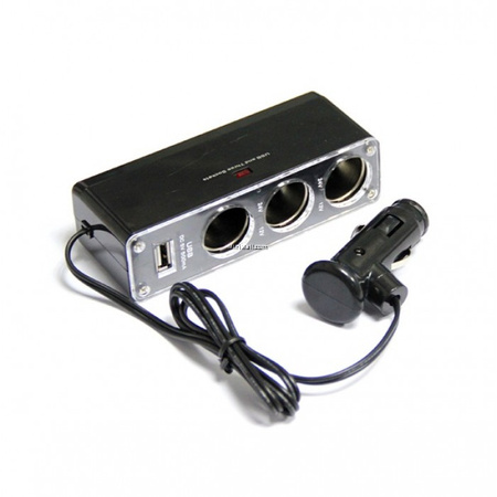 Samochodowy rozgałęźnik do gniazda zapalniczki na napięcie 12V na 3 gniazda i 1 USB ,długość przewodu 90cm.,,Rozdzielacz gniazda zapalniczki samochodowej, jest bardzo przydatny w każdym aucie., Możemy do niego podpiąć jednocześnie trzy urządzenia np. ładowarkę , laptopa, cb radio, palmptopa oraz wiele innych urządzeń., Dodatkowo wbudowany port USB pozwala zasilić wiele urządzeń korzystających z możliwości zasilania przez USB., Rozgałęźnik jest bardzo solidnie wykonany i posiada diodę sygnalizującą stan zasilania.,,Opis produktu,Prąd ładowania USB: 500mA,,Napięcie wejściowe: 12/24V,,zabezpieczenie 2A (max 25W)Informacja o bezpieczeństwie