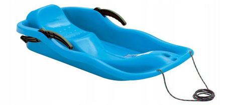 Głębokie sanki plastikowe z dźwigniami do hamowania i sterowania oraz linką do ciągnięcia.