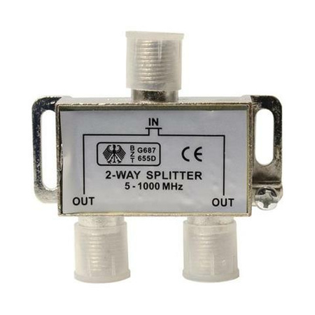 Splitter - rozdzielacz sygnału telewizyjnego z anteny DVB-T na 2 odbiorniki . 1 wejście - typu F. 2 wyjścia typu F. Częstotliwość: 5-1000 MHz. Obudowa metalowa.