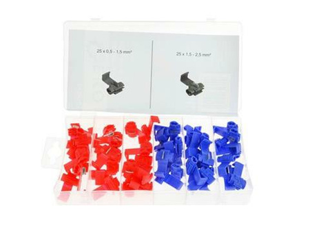 Zestaw szybkozłączek elektrycznych. Zapakowany w przezroczyste etui z przegródkami. W zestawie znajdują się szybkozłączki w rozmiarach: