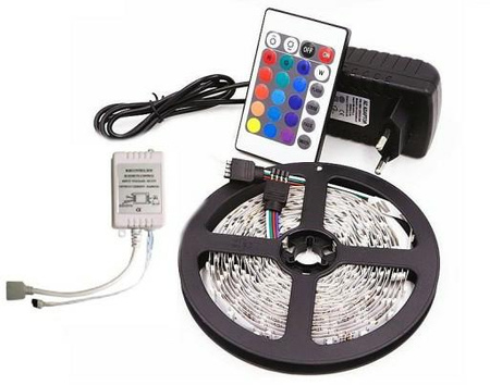 Taśma posiada 300 diod SMD 3528. Są to diody typu RGB, świecące jednym z trzech podstawowych kolorów: czerwonym, zielonym i niebieskim. Za pomocą kontrolera możemy włączać każdy z tych kolorów oraz zmieniać je w dowolnym momencie. Dodatkowo za pomocą pilota na podczerwień, wyposażonego w 24 przyciski, możemy przyciemnić lub rozjaśnić wybraną barwę. Możliwość dzielenia taśmy w miejscach oznaczonych nożyczkami.Informacja o bezpieczeństwie