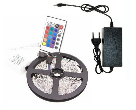 Taśma posiada zasilacz do podłączenia do prądu oraz pilota, który ułatwia sterowanie.