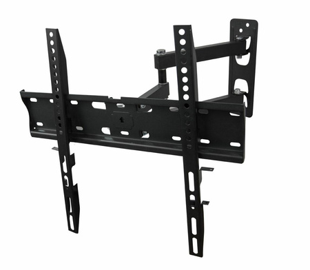 Metalowy, mocny uchwyt naścienny do telewizorów w rozmiarze od 26” do 70”. Łatwy w montażu. Zgodny ze standardem VESA 75x75 – 400x400. Posiada w zestawie małą poziomicę ułatwiająca wypoziomowanie uchwytu. Uchwyt posiada możliwość regulacji nachylenia, regulację kąta odchylenia w poziomie oraz regulację odległości telewizora od ściany.