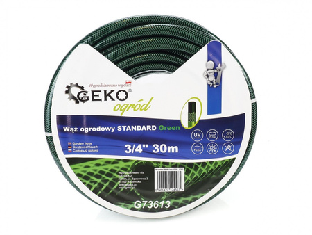 Wąż ogrodowy 3-warstwowy Standard Green 3/4” 30m,,Wąż ogrodowy 3-warstwowy 3/4” 30m wyprodukowany w Polsce. Charakteryzuje się dużą odpornością na warunki atmosferyczne oraz podniesioną odpornością na uszkodzenia mechaniczne dzięki 3-warstwowej strukturze wzmacnianej plecionym krzyżowym zbrojeniem tekstylnym. Ponad to materiały z jakich został wykonany zapobiegają osadzaniu się glonów wewnątrz węża.Informacja o bezpieczeństwie