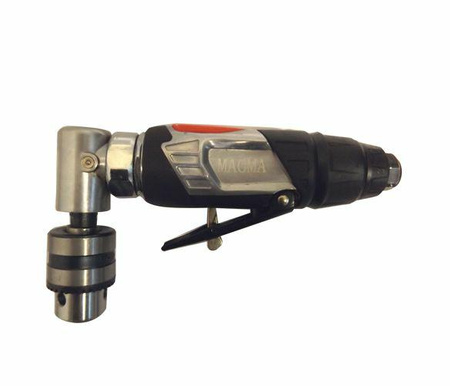 Pneumatyczna wiertarka kątowa wyposażona w spust z blokadą przeciw samoczynnemu uruchomieniu.