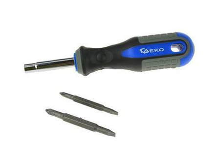 Wkrętak z wymiennymi końcówkami. Zestaw zawiera: wkrętak płaski 5 & 6 mm, wkrętak krzyżowy Philips #1 & #2, wkrętak z nasadką 1/4 in. & 5/16 in. Ogumowana antypoślizgowa rękojeść.Informacja o bezpieczeństwie