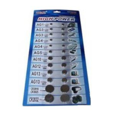 W zestawie: 2x AG1 (364A, D364, 364, 164, 602, T, V364, SR621SW, SR621W, SR60SR, LR60, CX60, V531, SB-AG, GP364, 280-34) 4x AG3 (SR41, LR41, S312E, MS312, S736, SR41, SG3, G3, 392, 192, RW87, V3GA, L736, GP192, G3A) 4x AG4 (LR626, SR626, LR66, SR66, 626A, AG4, G4, 377, D377, SR626W, SR626SW, RW329, V377, 177, V565, 606, SB-AW, 280-39, GP377) 2x AG5 (L754, G5, LR48, 193, 393, GP93A, SR754W) 2x AG10 (G10, LR1130, 189, V10GA, RW89, D189, L1131) 2x AG12 (G12, LR43, 186, V12GA, RW84, D186) 4x AG13 (G13, LR44, A76, RW82, V13GA, 357, SR44W, RW42, V357) 1x CR2016 (DL2016, ECR2016, FA, SBT11, BR2016, 208-202, 208-204, 208-206, DL2016B, BR2016-1W, CR2016-1W, KCR2016, L10, LM2016, LF1/4V) 1x CR2025 (DL2025, ECR2025, NA, BR2025, 208-205, DL20256B, BR2025-1W, CR2025-1W, KCR2025, L12, LM2025, SB-T14, LF1/2V, 5003LC) 2x CR2032 (DL2032, BR2032, KL2032, L2032, ECR2032, 5004LC, KCR2032, E-CR2032, KECR2032, SB-T15, CR2032H, SR2032, CD2032)