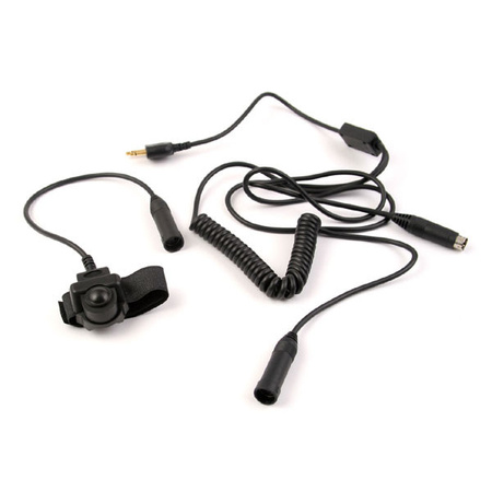 Zestaw połączeniowy z wtyczkami 2,5mm oraz 3,5mm do radia oraz wodoodpornym przyciskiem nadawanie/odbiór mocowanym na rzep do kierownicy.