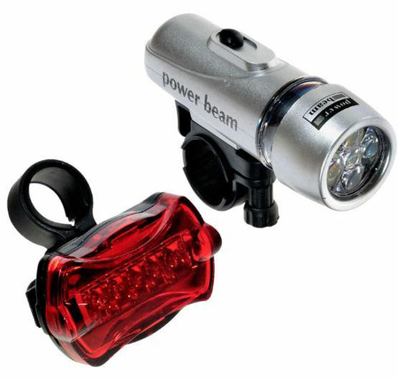 Zestaw lamp rowerowych LED. Strumień świetlny: 20 lm. Zasięg świecenia: max. 100 m. Zasilanie bateryjne: lampa przednia - 4 x AAA (brak w zestawie), lampa tylna - 2 x AAA (brak w zestawie). 3 tryby świecenia. Opakowanie: blister.Informacja o bezpieczeństwie