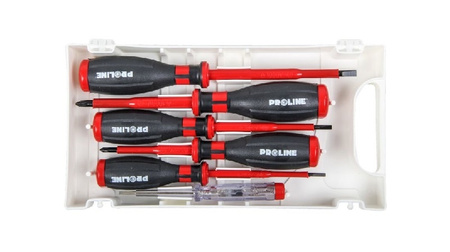 Narzędzia dla elektryka - wkrętaki Proline 10510,,Grot wkrętaków z wysokogatunkowej stali molibdenowo-chromowo-wanadowej odpornej na ścieranie i skręcanie.,Twardość grotu 58 +/- 2HRC.,,Narzędzia izolowane dwuskładnikowym tworzywem antypoślizgowym do 1000V,,Rękojeść z kauczuku (antypoślizgowa) zapewniająca doskonały chwyt.,,Wkrętaki płaskie: 5.5x125, 4x100, 3x100 mm.,,Wkrętaki Pozidriv: PZ1x80, PZ2x100 mm.,Wskaźnik napięcia: 125-250 V 140 mmInformacja o bezpieczeństwie